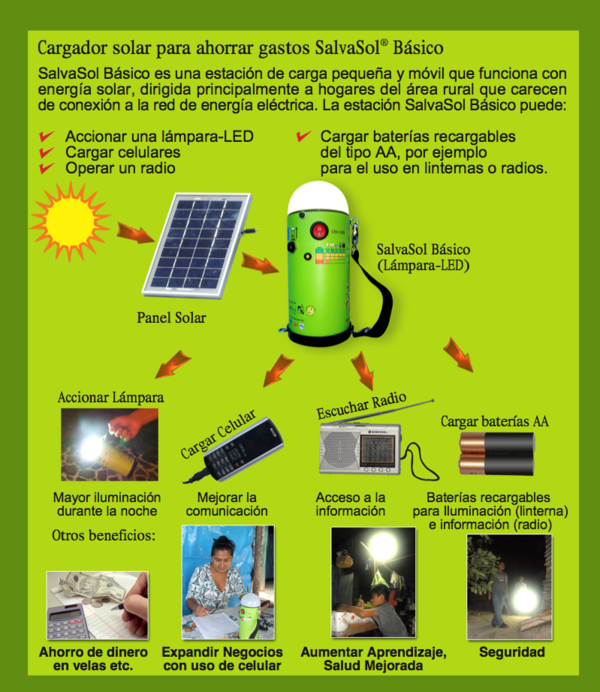 Esta estación portátil SalvaSol Básico se carga solarmente y suple la necesidad de aportar energía eléctrica ecológica principalmente a hogares rurales ó lugares desconectados a la red eléctrica.